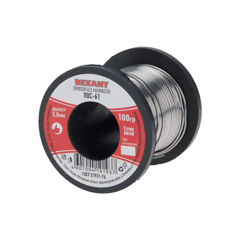 Припой в катушке ПОС-61 Ø0,8 мм (без канифоли) REXANT предназначен для создания механически прочного и герметичного соединения деталей между собой или для их фиксирования на плате (пайка и лужение радиоэлектронных приборов, медицинской аппаратуры, автодеталей, печатных плат, электроаппаратуры и т.д.).