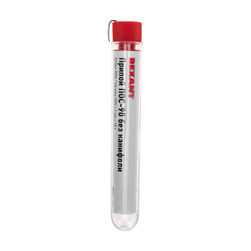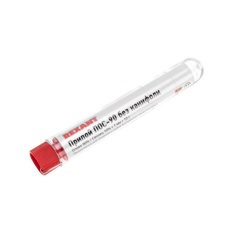 Припой без канифоли ПОС-90, 10г, Ø1мм, (олово 90%, свинец 10%), колба REXANT