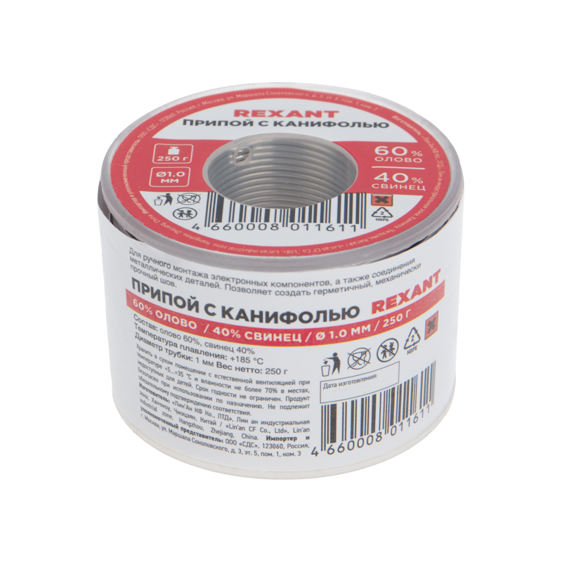 Припой с канифолью REXANT представляет собой проволоку (диаметром 1 мм) из сплава олова (60 %) и свинца (40 %). Используется в пайке для соединения деталей между собой и позволяет создать герметичный, механически прочный (устойчивый) шов. Нагреваясь до температуры плавления (183...188 °C) припой: расплавляется, смачивает спаиваемый металл и, растекаясь по нему — заполняет место между соединяемыми деталями.