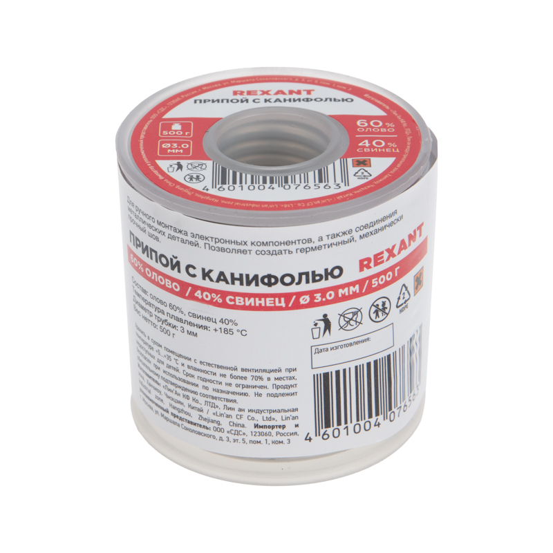 Припой с канифолью REXANT представляет собой проволоку (диаметром 3,0 мм) из сплава олова (60 %) и свинца (40 %).
