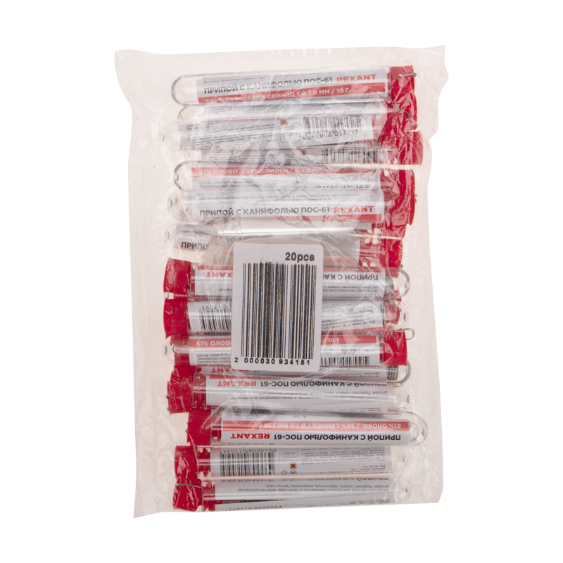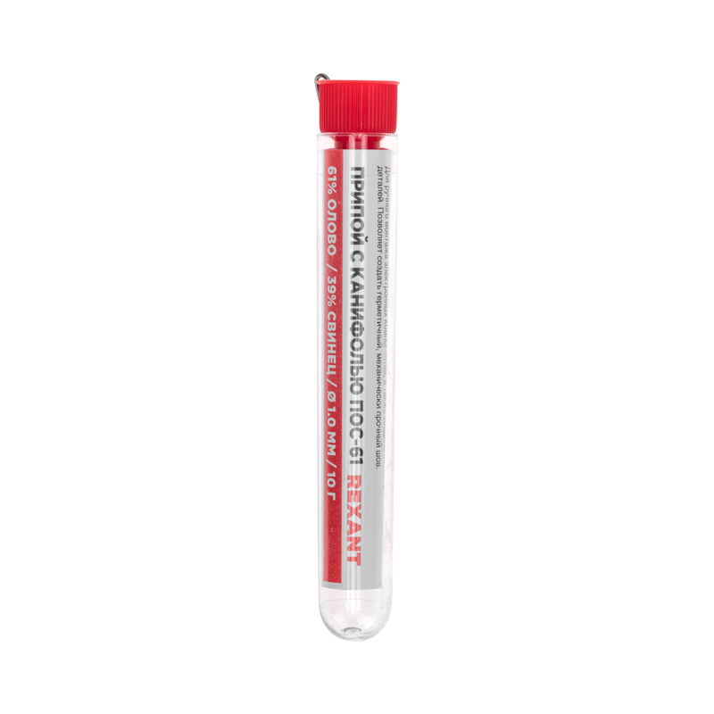 Припой с канифолью REXANT представляет собой проволоку (диаметром 1 мм) из сплава олова (61 %) и свинца (39 %). Используется в пайке для соединения деталей между собой и позволяет создать герметичный, механически прочный (устойчивый) шов. Нагреваясь до температуры плавления (183...188 °С) припой: расплавляется, смачивает спаиваемый металл и, растекаясь по нему — заполняет место между соединяемыми деталями.