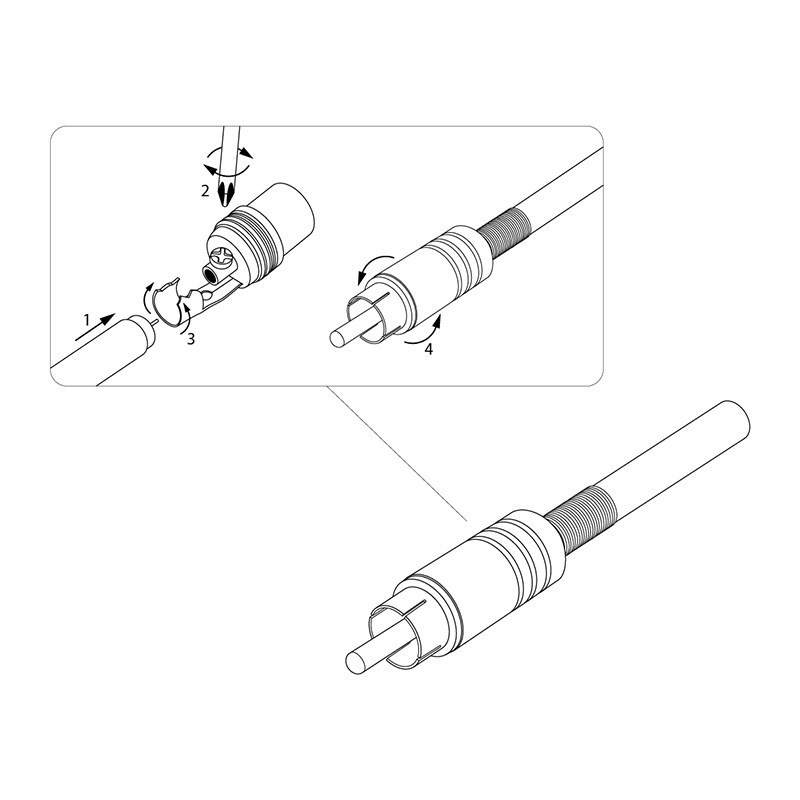 Установка провода в разъеме производится с помощью винтового зажима центрального контакта (центральная жила - под винт, оплетка - обжимается), что значительно экономит время монтажа.