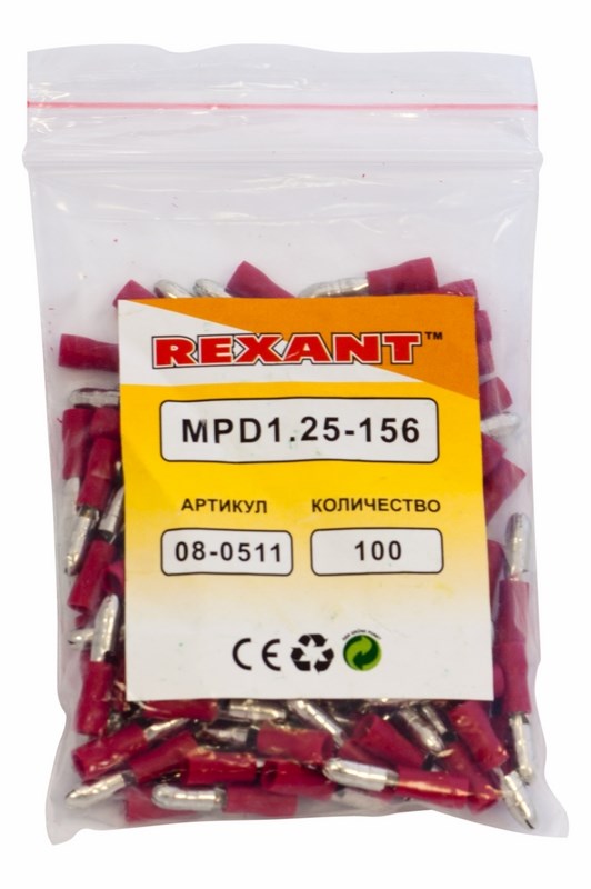 Изолированная штекерная клемма REXANT состоит из двух компонентов: металлического коннектора (штекер) и защитного изолятора, закрывающего место обжима провода. Металлический коннектор изготовлен из латуни, с поверхностным электролитическим лужением, а изолятор клеммы из поливинилхлорида (ПВХ), надежно защищающий место обжима кабеля от физических воздействий, а человека от поражения электрическим током. Обжатие производится специальными пресс-клещами (ht-301 H, ht-301 N, ht-301 W) поверх защитного изолятора. Цвет изолятора красный.