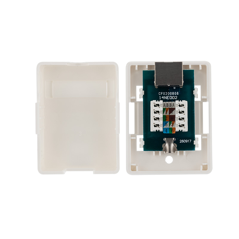 Устройство оснащено гнездом RJ- 45 категории 6 под разъем 8P8C (8 посадочных мест и 8 контактов). Кабель фиксируется с помощью зажимных контактов.