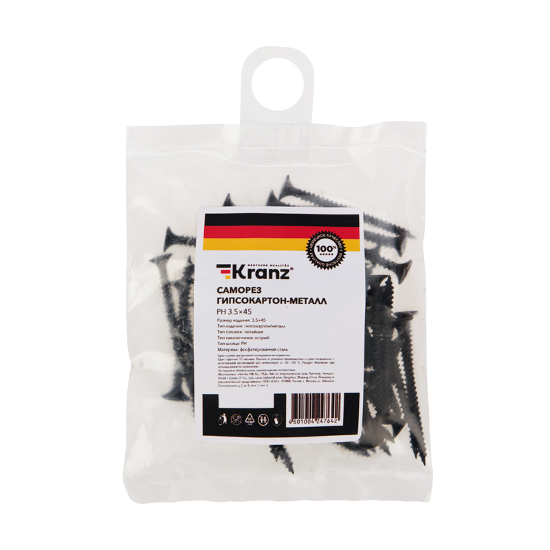 Саморезы изготовлены из стали и обработаны методом фосфатирования, что делает их устойчивыми к коррозии и механическим повреждениям. Потайная головка полностью погружается в материал, оставляя поверхность заготовки ровной и гладкой. Резьба с частым шагом обеспечивает надежное крепление самореза в тонколистовом металле. Не рекомендуется использование совместно с пластиковыми дюбелями.