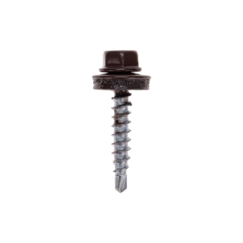 Саморезы изготовлены из стали и покрыты цинком, что делает их устойчивыми к коррозии и механическим повреждениям, что особенно важно при эксплуатации на крыше, где материал подвергается воздействию атмосферных факторов. EPDM-уплотнитель на шляпке обеспечивает плотное и герметичное соединение элементов кровли. Наконечник-сверло легко проникает в материал толщиной до 5 мм без предварительного сверления, что упрощает процесс монтажа. Шестигранная головка самореза покрыта порошковой краской RAL 8017, благодаря чему подобрать саморез под цвет крыши становится проще.