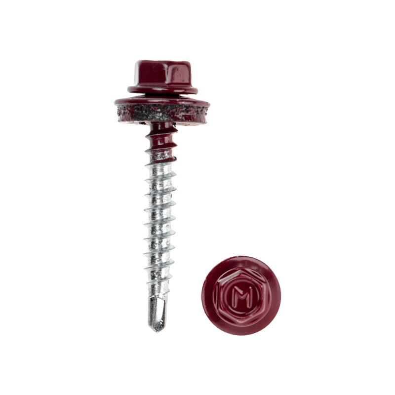 Саморезы изготовлены из стали и покрыты цинком, что делает их устойчивыми к коррозии и механическим повреждениям, что особенно важно при эксплуатации на крыше, где материал подвергается воздействию атмосферных факторов. EPDM-уплотнитель на шляпке обеспечивает плотное и герметичное соединение элементов кровли. Наконечник-сверло легко проникает в материал толщиной до 5 мм без предварительного сверления, что упрощает процесс монтажа. Шестигранная головка самореза покрыта порошковой краской RAL 3005, благодаря чему подобрать саморез под цвет крыши становится проще.