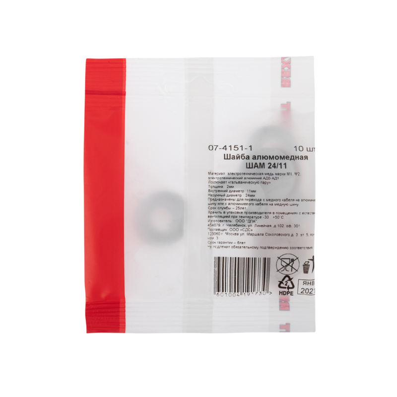 Шайба алюмомедная ШАМ 24/11 , REXANT предназначена для перехода с медного кабеля на алюминиевую шину или с алюминиевого кабеля на медную шину.