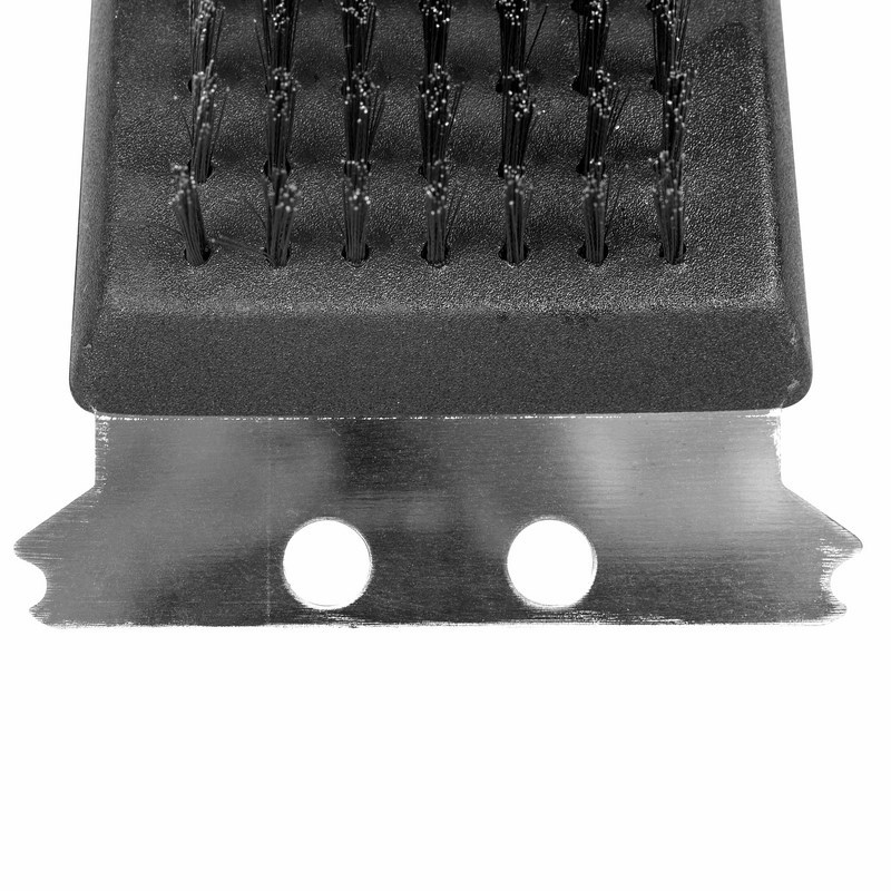 Жесткая металлическая щетина и скребок эффективно удаляют остатки пригоревшей пищи и другие сильные загрязнения. Благодаря специальной конструкции щетка способна вычищать мелкий сор и грязь даже из труднодоступных мест.