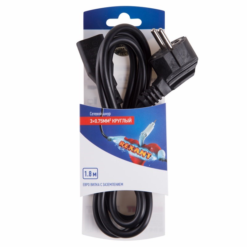 Шнур сетевой Евро 0.75мм² 1.8М (PE) (с заземлением) REXANT предназначен для подключения к сети переменного тока с напряжением 220B стационарных персональных компьютеров, мониторов, ИБП, принтеров и других периферийных устройств, имеющих штыревой разъём типа C14. Также шнур сетевой Евро (IEC cord) используются для питания многих видов электроприборов, например, усилителей для электронных музыкальных инструментов и профессионального звукового оборудования. Данный шнур IEC оснащен с одной стороны неразборной литой вилкой (евростандарт) с заземляющим контактом, с другой литым трёх контактным гнездовым разъёмом C13 и трехжильным проводом с сечением жил 0.75мм². Основные характеристики: