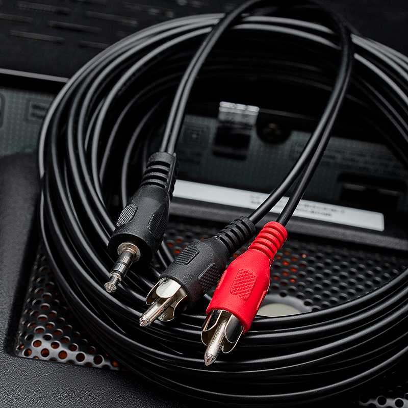 С одной стороны шнура располагается штекер разъема 3,5 мм стерео, а с другой — два штекера разъема RCA.