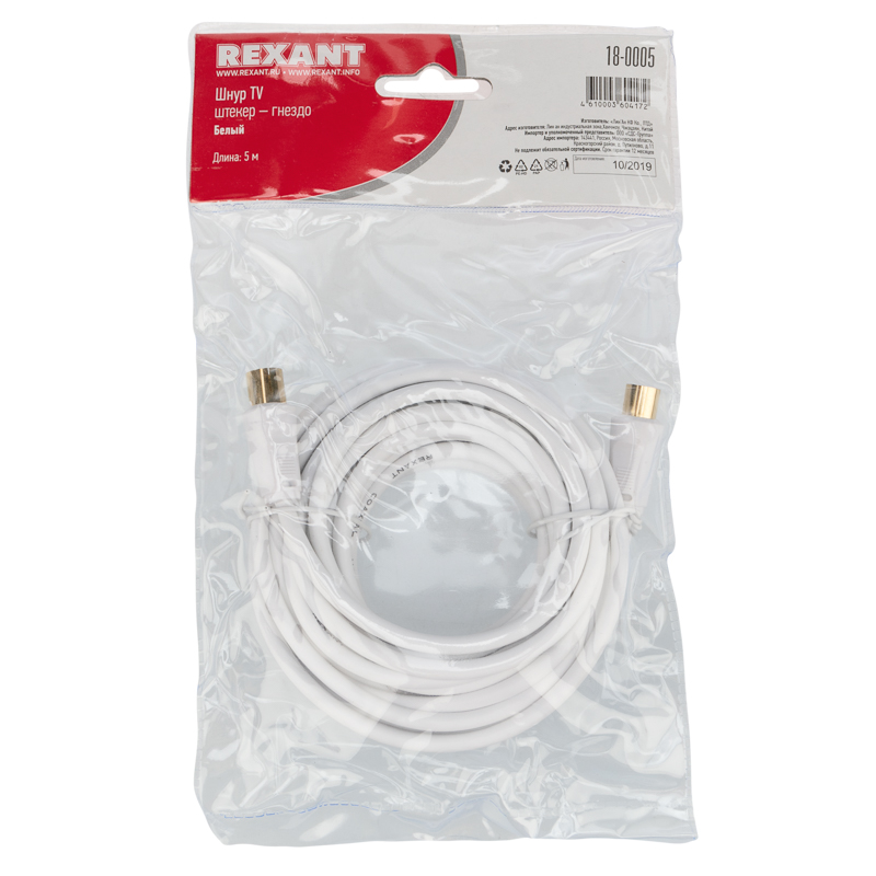 TV удлинитель REXANT предназначен для передачи аналоговых аудио- и видеосигналов телевизионной сети. Позволяет подключить телевизор и другое оборудование (ресиверы, ТВ-приставки и т.д.) к телевизионной розетке. Зачастую используется в качестве удлинителя высокочастотного кабеля для передачи ТВ сигнала от телевизионной антенны.