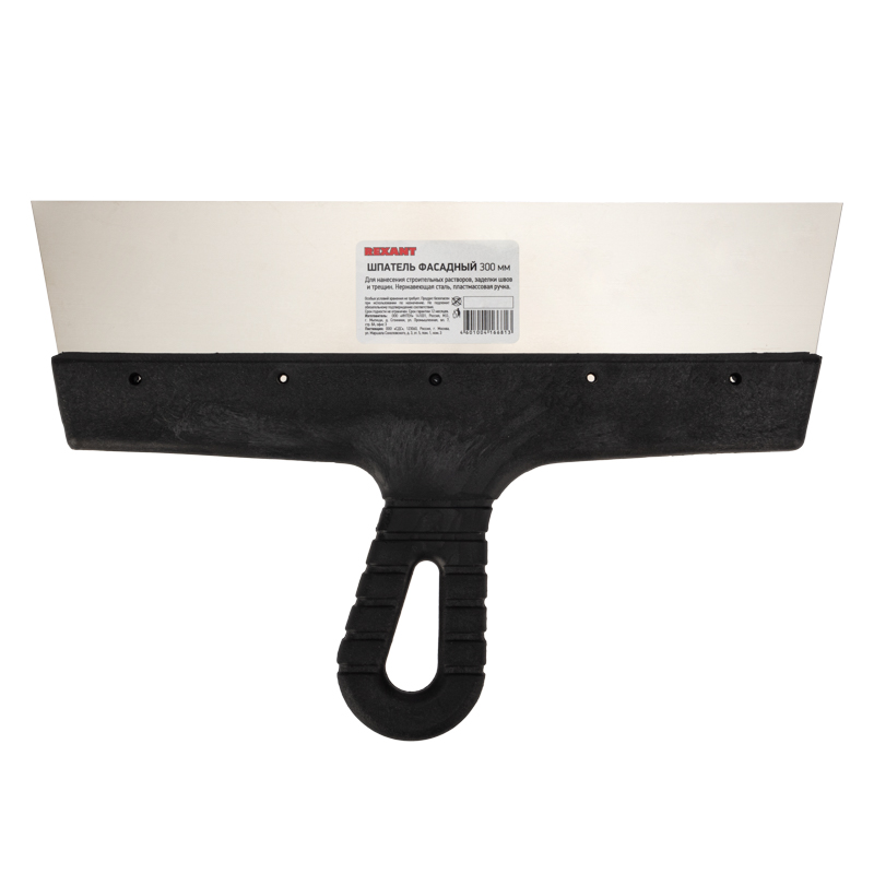 Фасадный шпатель оснащен эргономичной пластмассовой ручкой с рифлением, которая обеспечивает надежный хват инструмента, при использовании, в том числе, в грубых строительных перчатках. Основной рабочей частью шпателя является металлическое полотно, поэтому для производства шпателей мы используем нержавеющую сталь марки AISI 201 толщиной 0,4 мм высоконагартованную (1500 н/мм). Сталь данной марки обладает улучшенными механическими свойствами, исключающими деформацию полотна в процессе работы.