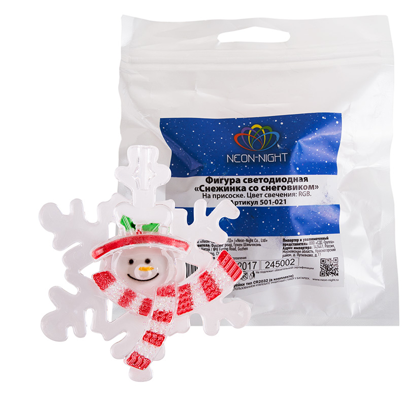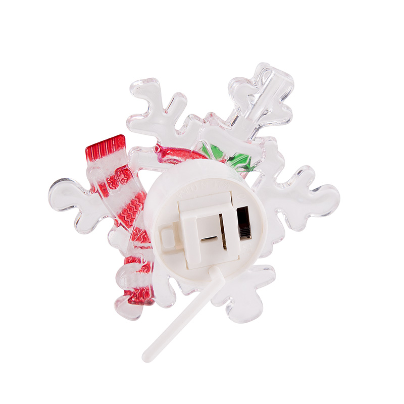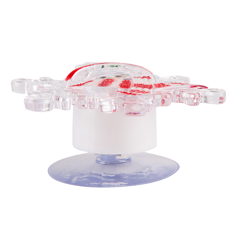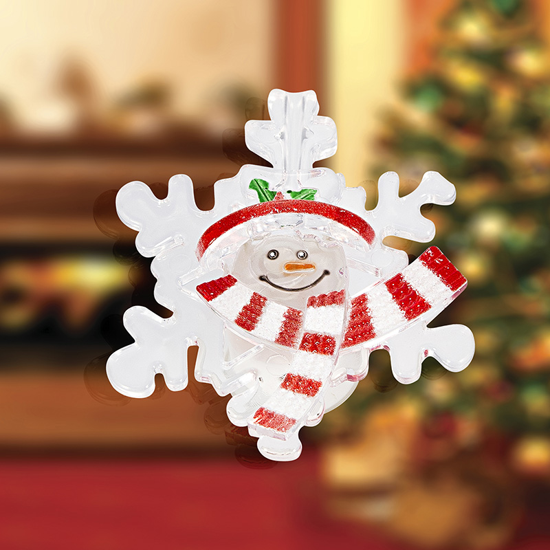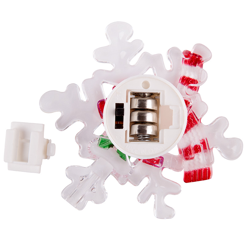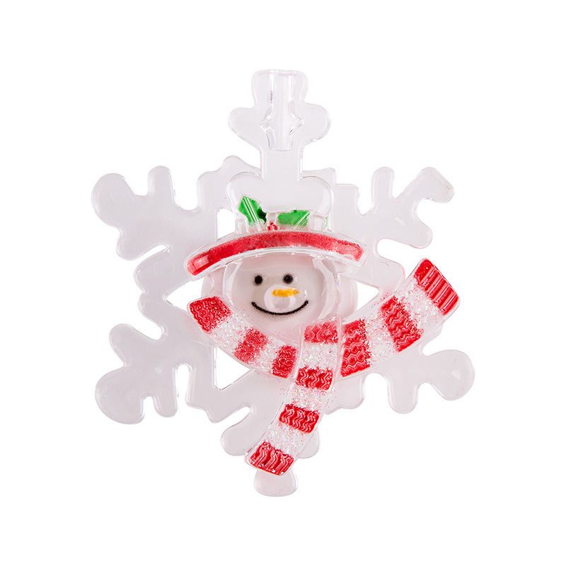 Светодиодная фигурка «Снеговик на снежинке» выполнена из прочного пластика. Прозрачная снежинка с изображением веселого персонажа крепится на любые гладкие поверхности при помощи присоски. В центре композиции находится яркий диод RGB, который светится разноцветными огнями, меняя оттенки в хаотичном порядке — в гамме 256 вариантов. На оборотной стороне расположен батарейный блок, рассчитанный на установку трех элементов питания типа LR41 (идут в комплекте). Светодиодная фигурка отлично смотрится на окне, зеркале, мебельных фасадах.