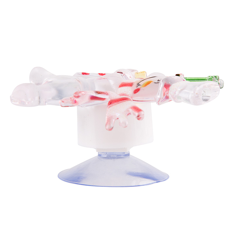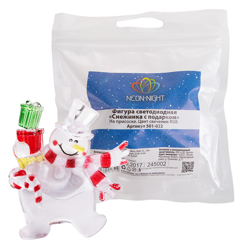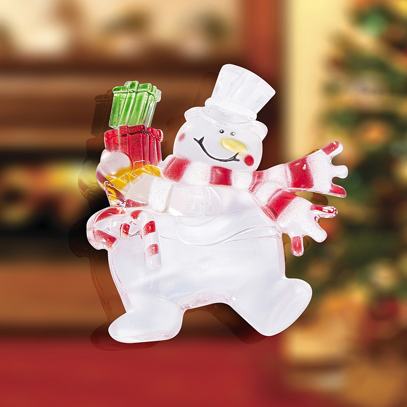 Светодиодная фигурка «Снеговик с подарком» выполнена в виде доброго забавного персонажа, который вызывает улыбку при одном взгляде на него. В центре декоративного изделия находится один светодиод RGB, меняющий цвета в хаотичном режиме. Оттенки плавно перетекают из одного в другой — всего 256 разных вариантов гаммы. На оборотной стороне расположен батарейный блок, рассчитанный на установку трех элементов питания типа LR41 (идут в комплекте). Крепкая присоска надежно фиксирует светодиодную фигурку на любых гладких поверхностях.