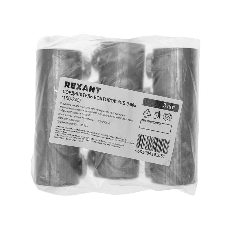 Соединитель болтовой 4СБ-3-005 (150-240) REXANT предназначен для электрического и механического соединения алюминиевых и медных жил кабелей и проводов путем затяжки болтами.