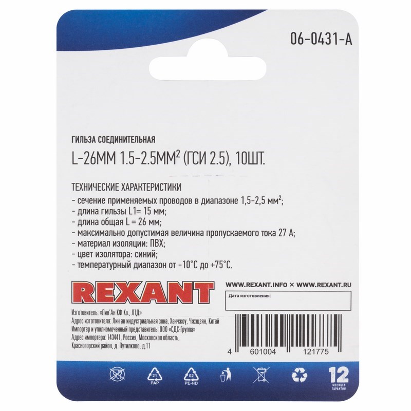 - длина гильзы L1= 15мм;