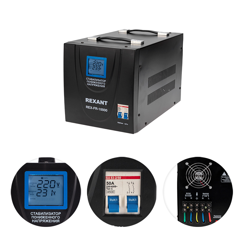 Однофазный стабилизатор переменного напряжения релейного типа марки REXANT используется для предотвращения поломки бытовых и промышленных электроприборов вследствие перепадов напряжения в сети.