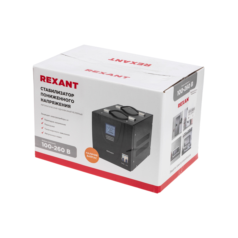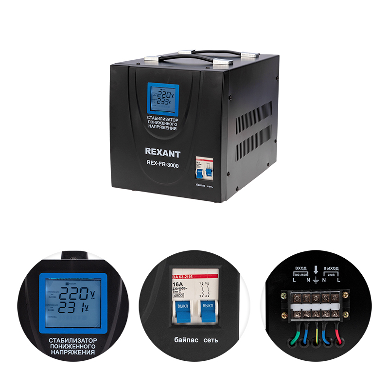 Однофазный стабилизатор переменного напряжения релейного типа марки REXANT используется для предотвращения поломки бытовых и промышленных электроприборов вследствие перепадов напряжения в сети.