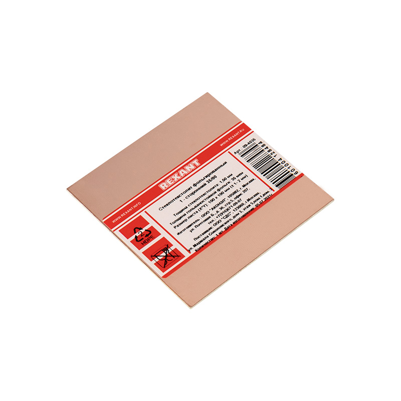Стеклотекстолит 1-сторонний 100x100x1.5 мм 35/00 (35 мкм) REXANT представляет собой композицию стеклоткани и связующего материала на основе эпоксидных смол, а также с одной стороны покрытый медной электролитической гальваностойкой фольгой толщиной 35 мкм.