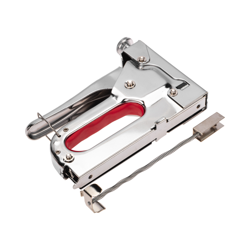 На корпусе инструмента располагается специальная скоба, которая фиксирует ручку и упрощает хранение степлера. Для обеспечения удобства во время работы на рукоятке предусмотрена резиновая накладка.