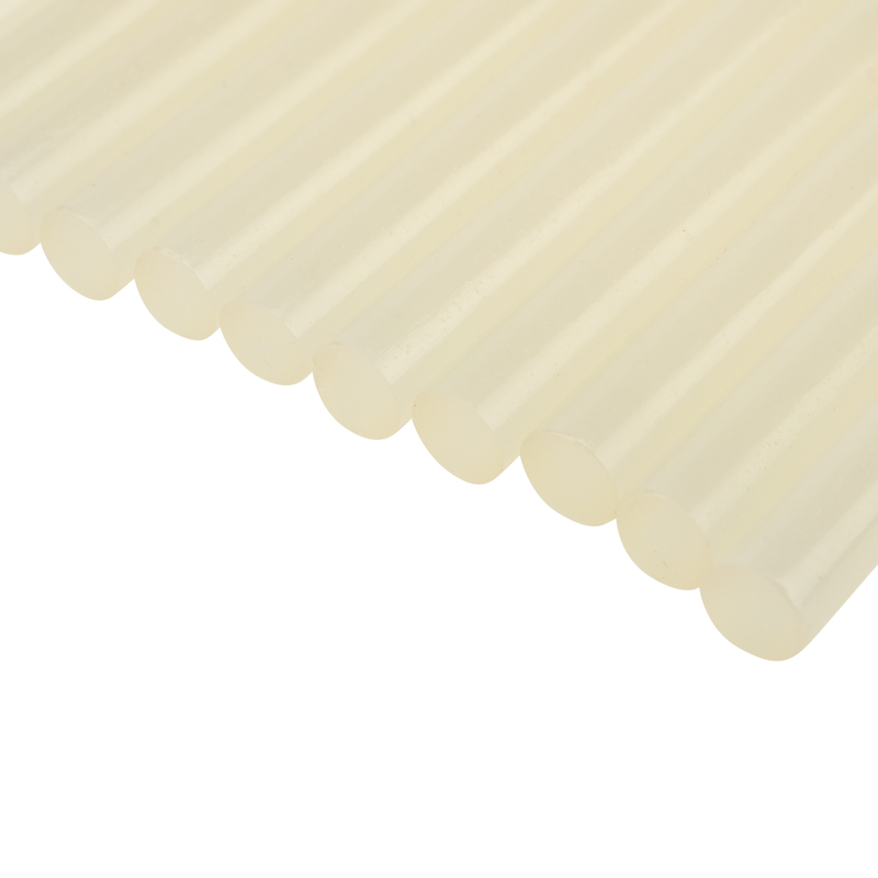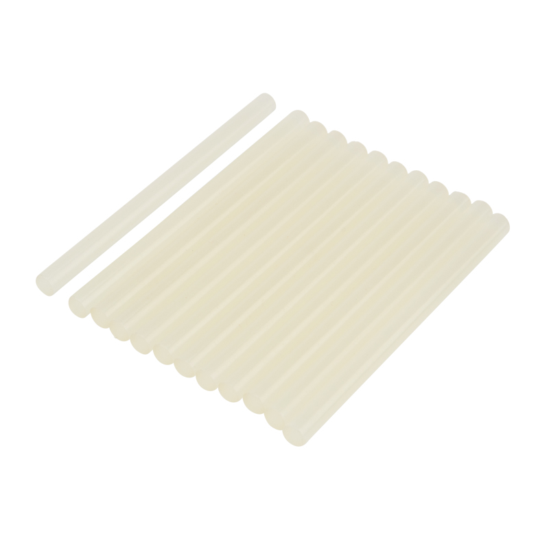 Изготовлены из ЭВА, поэтому полностью экологичны и безопасны при соблюдении правил использования. Обладают высокой скоростью и надежностью склеивания. Время застывания зависит от количества расплавленной массы. Длина стержней составляет 100 мм, набор подойдет для выполнения небольшого объема работ. Используются с клеевыми пистолетами с каналом для стержней соответствующего диаметра. Набор состоит из 12 клеевых стержней.