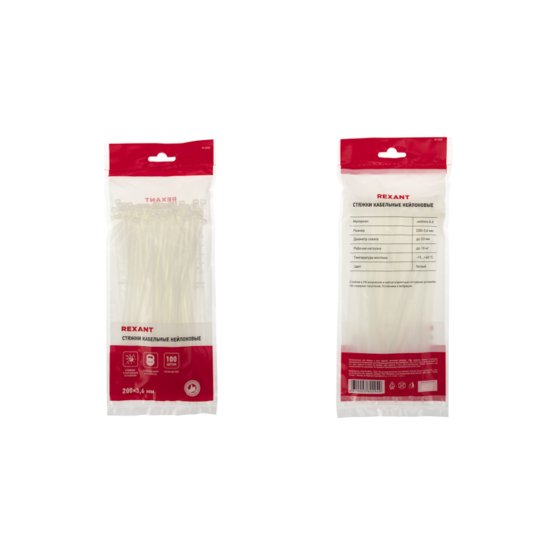 Стяжка кабельная нейлоновая 200x3,6мм, белая (100 шт/уп) REXANT