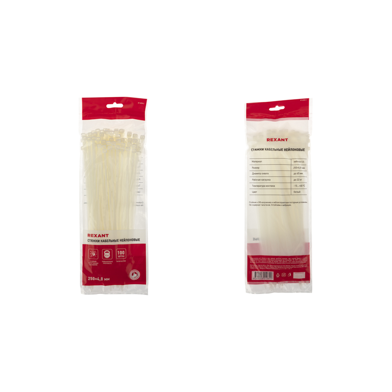 Нейлоновый хомут (кабельная стяжка) REXANT представляет собой белую гибкую полоску из полиамида с замковым механизмом одностороннего действия. Используется для крепления или соединения в жгут проводов, кабелей и любых разновидностей труб. Прочность, эластичность и простота монтажа позволяют использовать их на предприятиях и в быту.