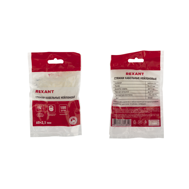 Нейлоновый хомут (кабельная стяжка) REXANT представляет собой белую гибкую полоску из полиамида с замковым механизмом одностороннего действия. Используется для крепления или соединения в жгут проводов, кабелей и любых разновидностей труб. Прочность, эластичность и простота монтажа позволяют использовать их на предприятиях и в быту.