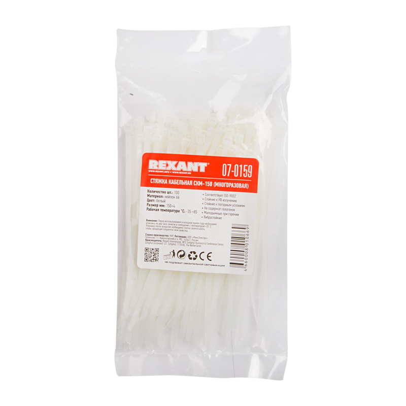 Хомут нейлоновый многоразовый REXANT 150x3,5 мм белого цвета предназначен для крепления или обвязки в жгут кабелей и проводов, гибких гофротруб, а также закрепления других объектов на несущей поверхности. Стяжка используется при проведении электромонтажных работ, при монтаже структурированных кабельных систем, а также для бытовых нужд.