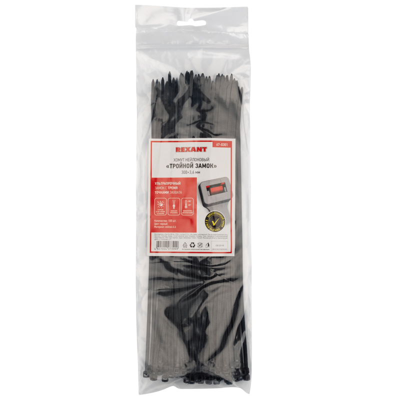 Представляет собой черную нейлоновую полоску с высоким уровнем гибкости размером 300x3,6 мм. Стяжка изготовлена из нейлона-6,6, износостойкого и прочного материала.