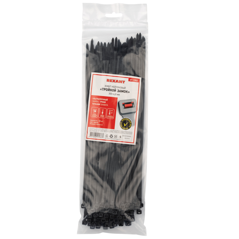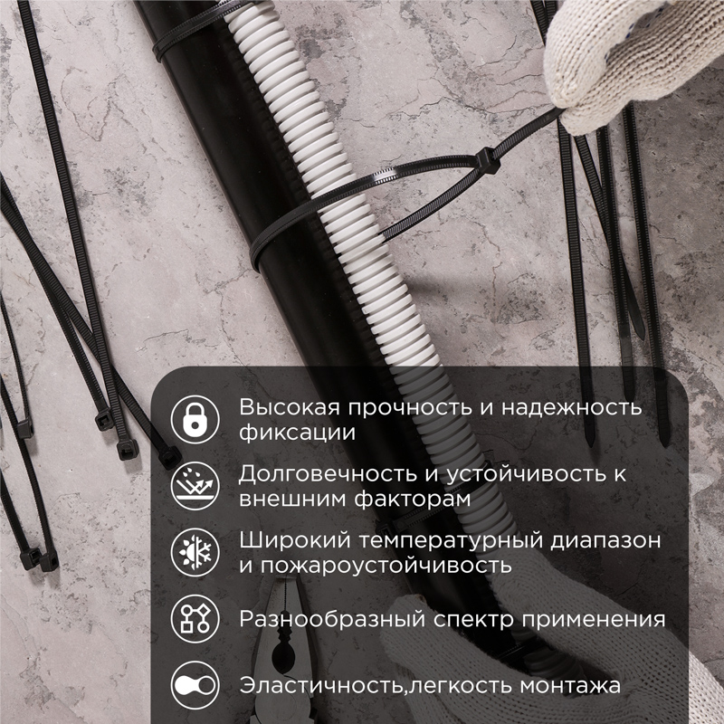Представляет собой черную нейлоновую полоску с высоким уровнем гибкости размером 300x4,8 мм. Стяжка изготовлена из нейлона-6,6, износостойкого и прочного материала.