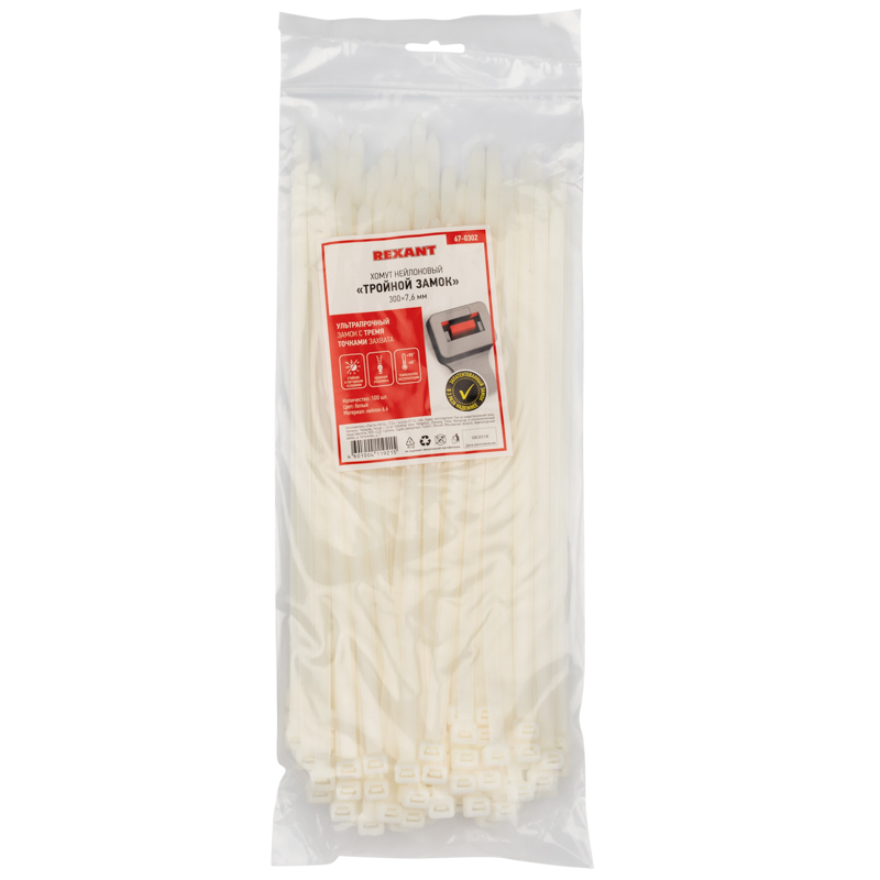 Представляет собой белую нейлоновую полоску с высоким уровнем гибкости размером 300x7,6 мм. Стяжка изготовлена из нейлона-6,6, износостойкого и прочного материала.