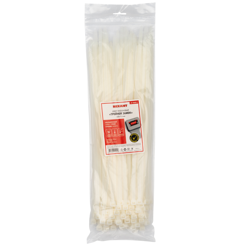 Представляет собой белую нейлоновую полоску с высоким уровнем гибкости размером 400x7,6 мм. Стяжка изготовлена из нейлона-6,6, износостойкого и прочного материала.