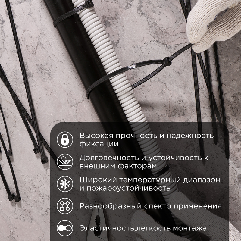 Представляет собой черную нейлоновую полоску с высоким уровнем гибкости размером 500x7,6 мм. Стяжка изготовлена из нейлона-6,6, износостойкого и прочного материала.