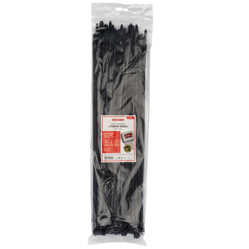 Изделия упакованы в герметичные пакеты многоразового использования с замком Zip-Lock. Этот тип упаковки обеспечивает удобное хранение и защиту от пыли, а также предотвращает потерю влаги. Стяжки упакованы в наборы по 100 штук.