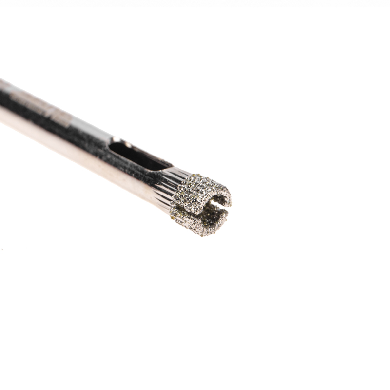 Режущая кромка покрыта промышленными алмазами высокой твердости, обеспечивающими точное и чистое сверление отверстий без трещин и сколов на поверхности материала.
