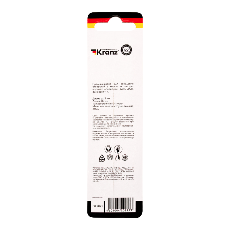 Сверло по дереву 5х85 мм, цилиндрический хвостовик Kranz