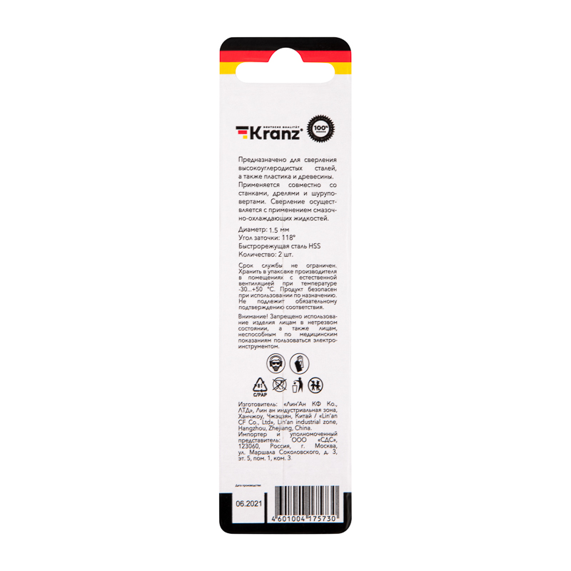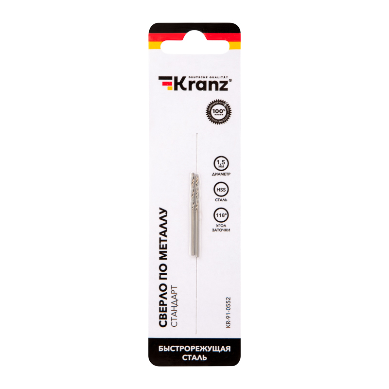 Сверло по металлу 1,5х40х18мм (HSS), DIN 338, 2 шт. в упаковке KRANZ