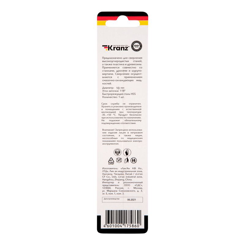Сверло KRANZ изготовлено по стандарту DIN 338 и используется для сверления отверстий в таких материалах, как сталь, дерево и пластик.