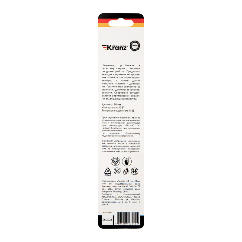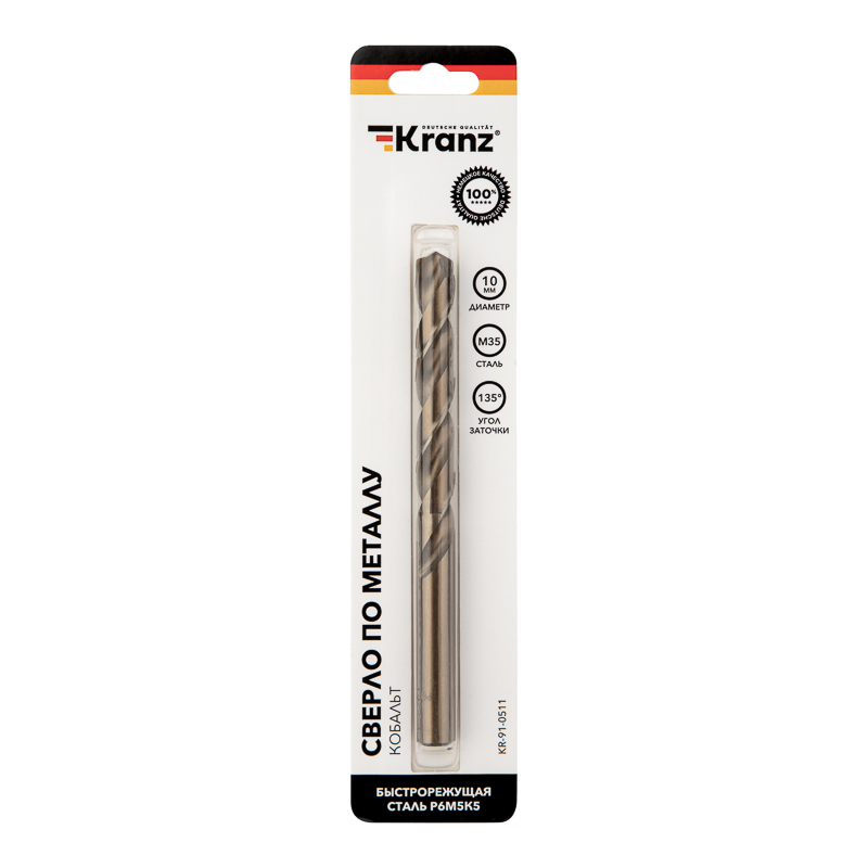 Сверло по металлу 10х133х87мм «Кобальт» (сталь HSS-Co 5% M35 P6M5K5) DIN 338, 1 шт. в блистере KRANZ