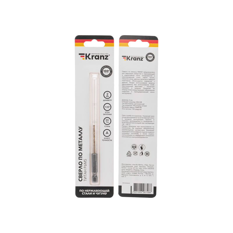 Сверло по металлу, 2мм, Р6М5, ТИТАН, шестигранный хвостовик (1 шт. в упаковке) DIN 338 KRANZ