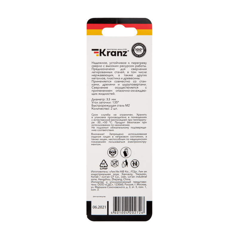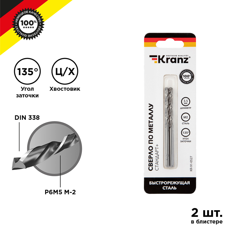 Сверло по металлу 3,5х70х39мм «Стандарт+» (P6M5 M-2) DIN 338, 2 шт. в блистере KRANZ