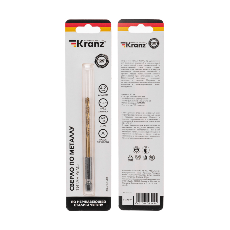 Сверло по металлу, 4,2мм, Р6М5, ТИТАН, шестигранный хвостовик (1 шт. в упаковке) DIN 338 KRANZ