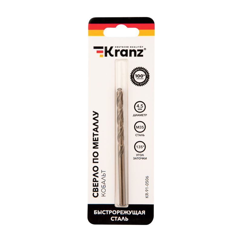 Сверло по металлу 4,5х80х47мм «Кобальт» (сталь HSS-Co 5% M35 P6M5K5) DIN 338, 1 шт. в блистере KRANZ