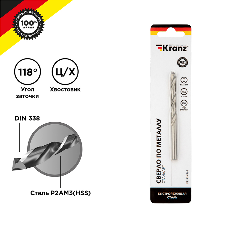 Сверло KRANZ изготовлено по стандарту DIN 338 и используется для сверления отверстий в таких материалах, как сталь, дерево и пластик.