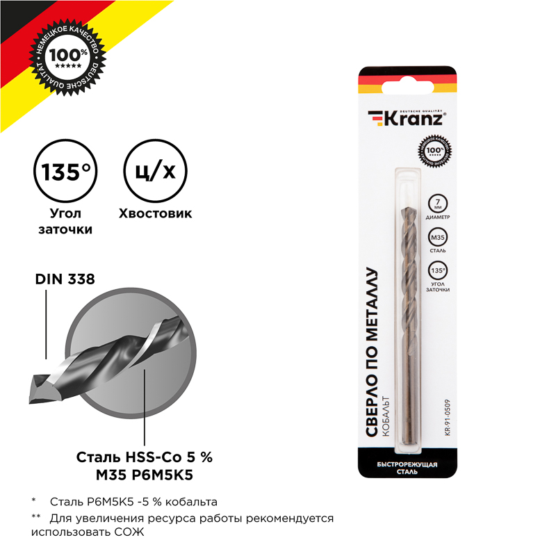 Сверло по металлу 7х109х69мм «Кобальт» (сталь HSS-Co 5% M35 P6M5K5) DIN 338, 1 шт. в блистере KRANZ