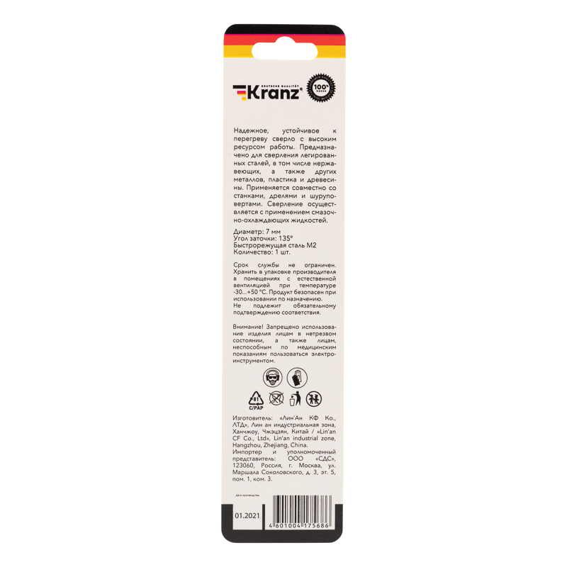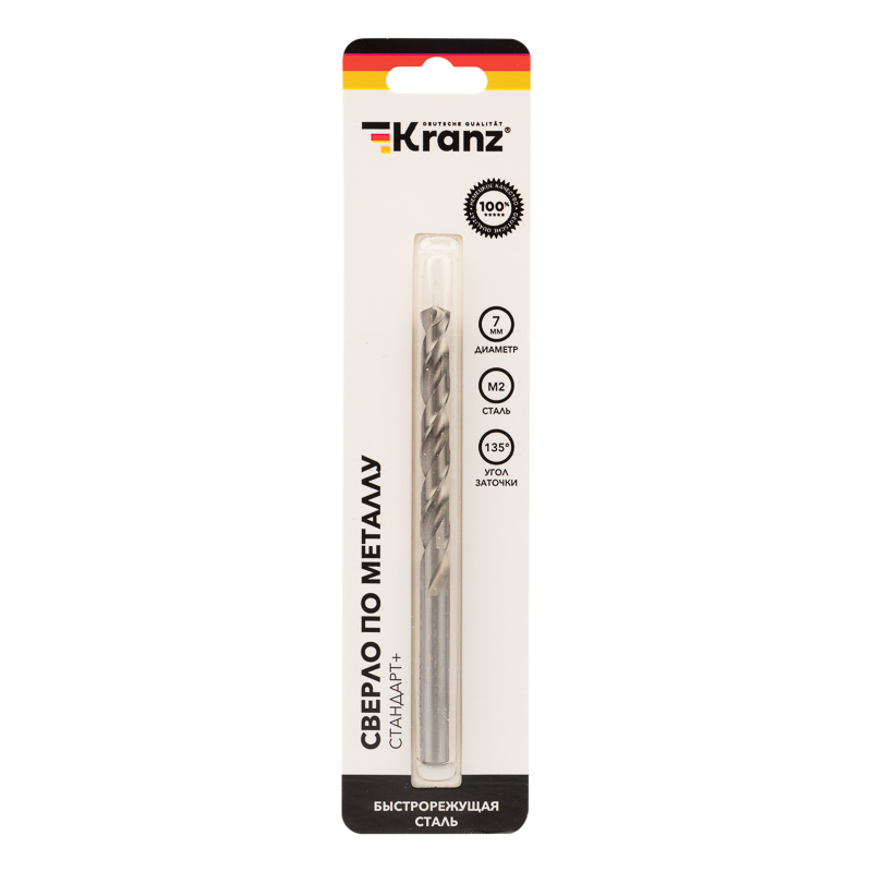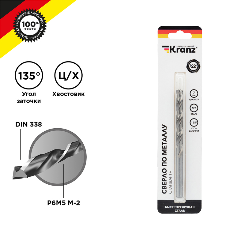 Сверло по металлу 7х109х96мм «Стандарт+» (P6M5 M-2) DIN 338, 1 шт. в блистере KRANZ