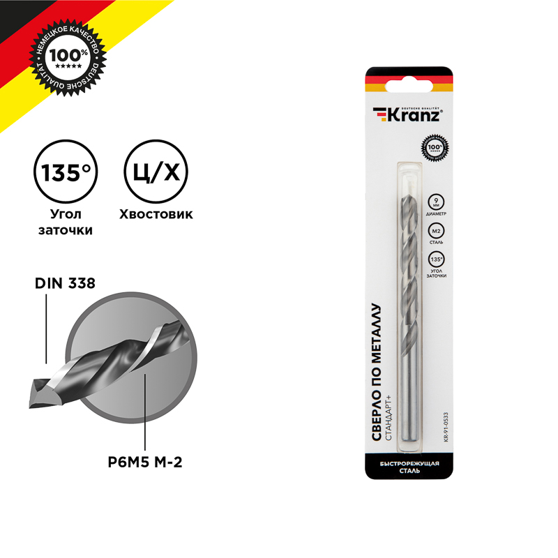 Сверло по металлу 9х125х81мм «Стандарт+» (P6M5 M-2) DIN 338, 1 шт. в блистере KRANZ