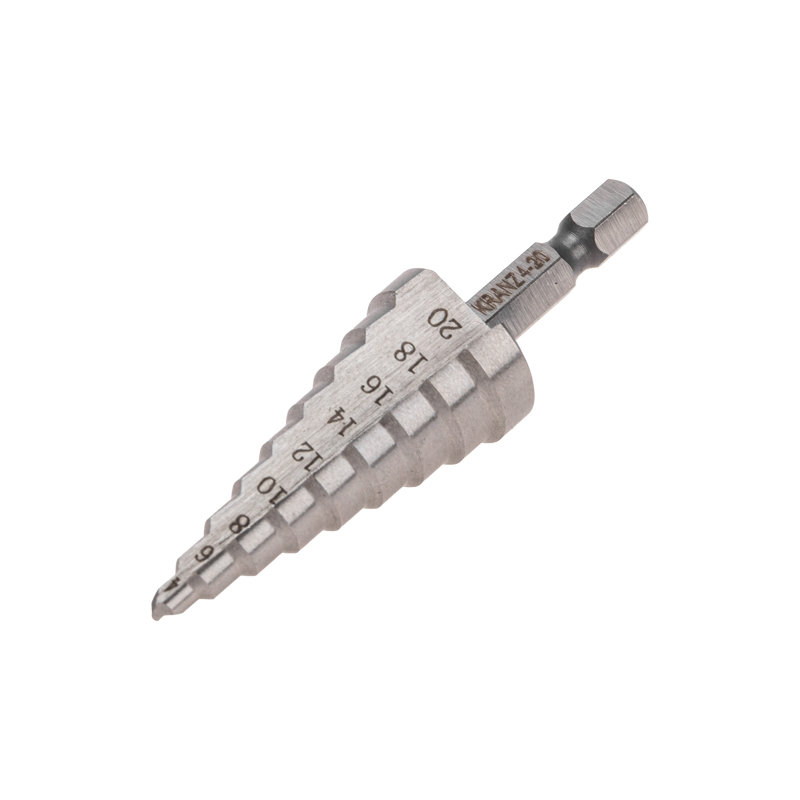 На каждой из 9 ступеней сверла нанесена маркировка фактического диаметра. Диапазон ступеней: 4, 6, 8, 10, 12, 14, 16, 18, 20 (шаг 2 мм).